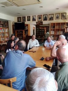 Στη συνέχεια ο κ. Παπαγιαννίδης μετέβη στο Προσκύνημα της Παναγίας και στην πλατεία της αγοράς όπου κατά τη διάρκεια του καφέ είχε την ευκαιρία να ενημερωθεί αναλυτικά από τον Πρόεδρο του Αναγνωστηρίου για την ιστορία του πολιτιστικού ιδρύματος και τις προσπάθειες που γίνονται όλα αυτά τα χρόνια για την αποκατάσταση του θεάτρου.